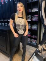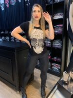 Essa T-shirt com estampa de caveira e aplicações de pedraria é a fusão perfeita entre ousadia e glamour. Vista-se para expressar sua personalidade única e desfrute do charme das caveiras com um toque de brilho.